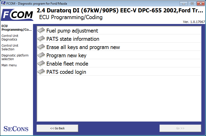 PATS-functies zijn beschikbaar in de diagnosesessie voor PCM- en IPC-ECU's in het programmeer-/coderingsmenu. Voor gebruikers die bekend zijn met Ford IDS-diagnostiek hebben we ter vergelijking screenshots van Ford IDS toegevoegd.