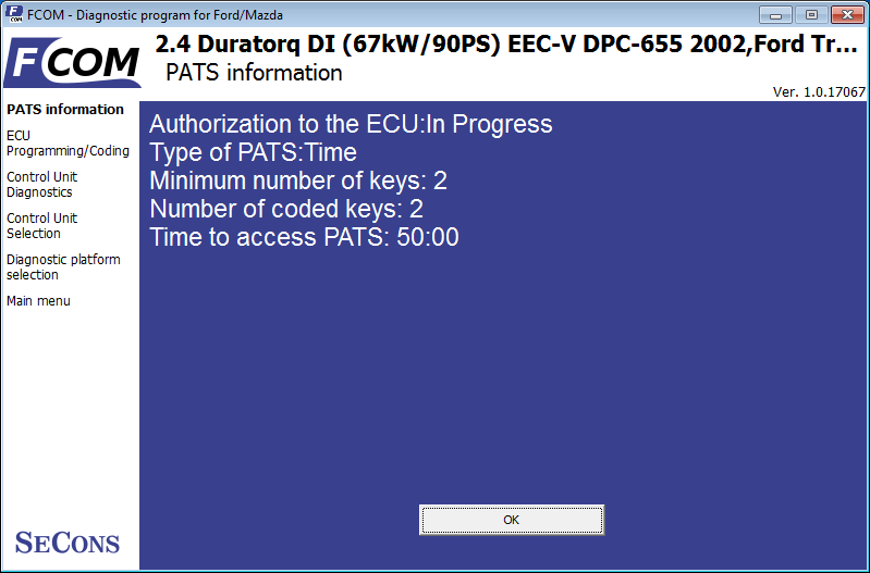 Voor voertuigen die meerdere ECU's gebruiken voor het PATS-systeem (bijv. PCM en IPC, BCM RKE of SCIL), moeten ECU's dezelfde voertuigbeveiligingsgegevens bevatten. Voor dit doel biedt FCOM de functie “PATS Pairing”, een beschikbaar coderingsmenu van niet-PCM ECU (IPC, BCM, SCIL of RKE). De functie is alleen beschikbaar op gecodeerde PATS.