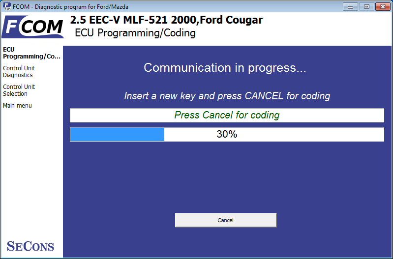 U kunt het lopende aftellen annuleren door op de knop Annuleren te klikken. Terwijl FCOM wacht tot de regeleenheid is ontgrendeld, communiceert deze met de regeleenheid en daarom moet het contact worden ingeschakeld.