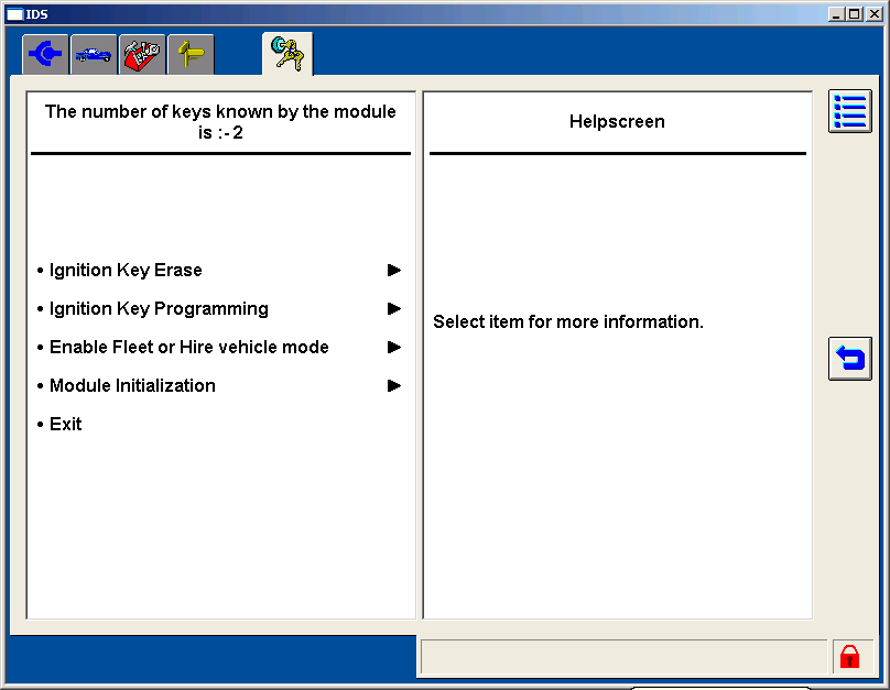 Deze functie toont alle belangrijke informatie over het PATS-systeem en de status ervan. Ford IDS biedt deze functie niet.